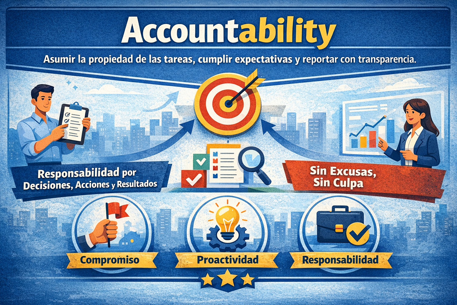ACCOUNTABILITY Consiste en asumir la propiedad de las tareas, cumplir las expectativas y reportar el progreso con transparencia. Implica responsabilidad plena por decisiones, acciones y